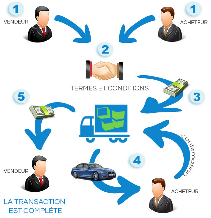 - Le vendeur et l'acheteur ont déjà accepté et ont discuté quant à la transaction et ils veulent utiliser notre dépôt fiduciaire (avec l'inspection de véhicule) et des services d'expédition; les fonds sont transférés au compte bloqué mais le vendeur sera payé à la fin de la transaction;