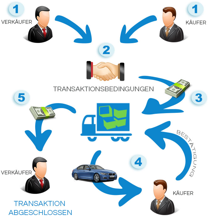 - Der Verkäufer und der Käufer haben sich bereits über die Transaktion verständigt und wollen den Treuhand- und Versandservice (einschließlich Fahrzeugkontrolle) in Anspruch nehmen. Die Geldmittel werden zwar an das Treuhandkonto übertragen, jedoch wird der Verkäufer erst am Ende der Transaktion bezahlt;
